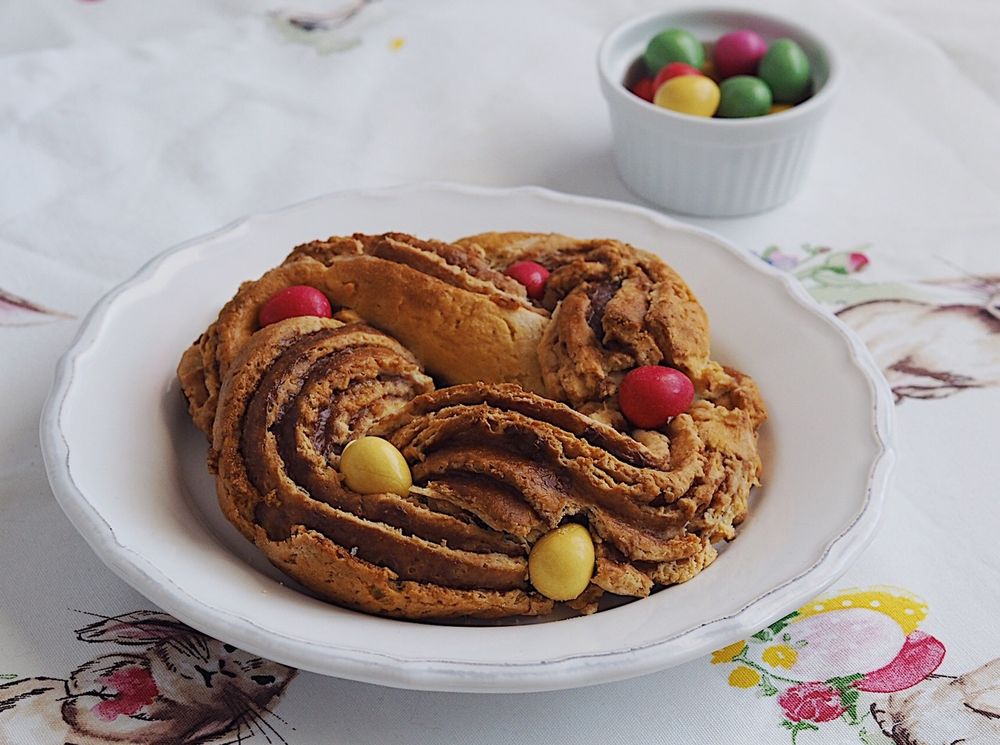 • Easter table setting with colored orange eggs, plate of hot cross buns, green branches decorated, glass of cocktail drink over white plank wooden table with textile tablecloth.