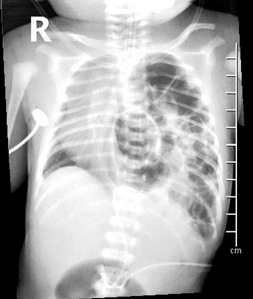 Rentgenový snímek novorozence s vrozenou brániční kýlou, Zdroj: Shutterstock