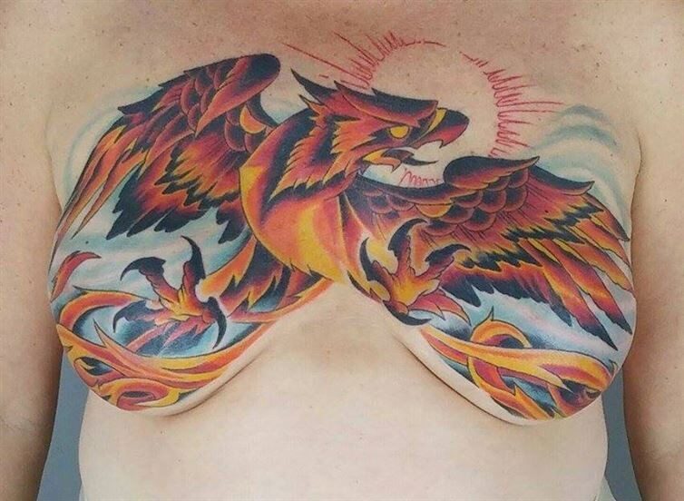 Carrie George prodělala bilaterální mastektomie v roce 2012 a rozhodla se pro změnu. Její tetování není jen tak obyčejné. Vybrala si záměrně motivy, které pro nic něco znamenají. Takže proto sova, listy a ohnivá koule. Nyní cítí na své hrudi klid.