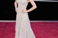 Jennifer Lawrence oblékl do šatů pastelových tónů Dior. Objemná sukně se však herečce nevyplatila hned v úvodu. Šaty se jí pletly pod nohy, a tak když stoupala na pódium převzít si ocenění za nejlepší ženský herecký výkon v hlavní roli, upadla na schodech.