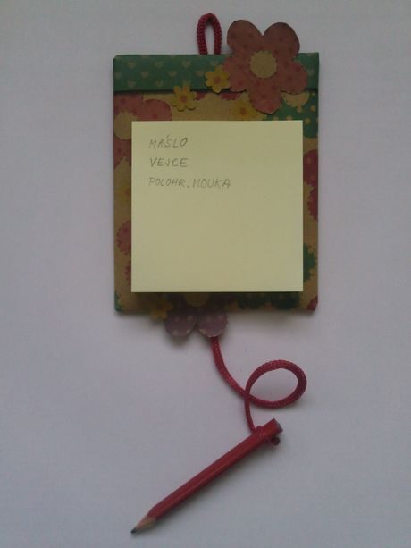Pokud ano, můžete si vyrobit další jako dárek někomu z blízkých. Takový zápisník je totiž nejen hezkou, ale zároveň užitečnou dekorací. Kolikrát se stane, že člověk v obchodě přemýšlí nad spoustou věcí a zapomene něco koupit. Někdy by to nevadilo, ale když chcete dělat třeba palačinky a nekoupíte mouku, může to být problém.
