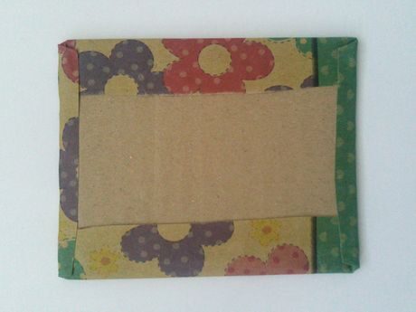 Nejprve si připravíme podklad. Balicí papír přiložte ke kartonu, přečnívající kraje zahněte do zadní strany (nejprve zahněte boční, poté horní a spodní strany) a přilepte. Pokud máte papír silnější, je dobré na to položit na chvíli nějaké závaží, například knížku.