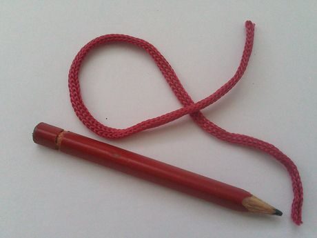 Než lepidlo zaschne, připravíme si tužku s provázkem. Na tužce uděláme v horní části zářez, aby provázek nemohl při používání sklouznout. Přivážeme ho pevně okolo a začistíme jeho konec. Na obrázku je například použit provázek z umělého materiálu, proto ho stačí k začištění mírně opálit (mírně je důležité slovo, syntetické materiály rychle hoří a my si chceme kuchyň vyzdobit, ne podpálit).