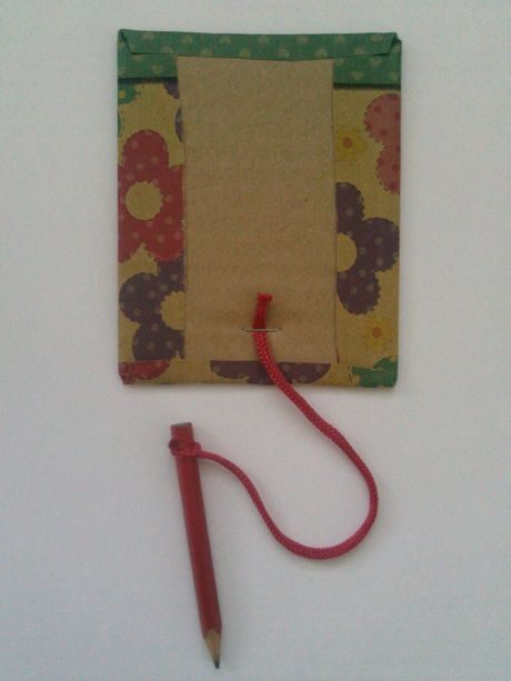 Lepidlo už jistě zaschlo, proto můžeme provázek připevnit na zadní část podkladu (dejte si pozor na stranu, kam ho připevňujete, aby nebyl zápisník vzhůru nohama). Můžete ho přilepit lepidlem, lepší by však byla lepicí páska nebo sešívačka, aby to dobře drželo.
