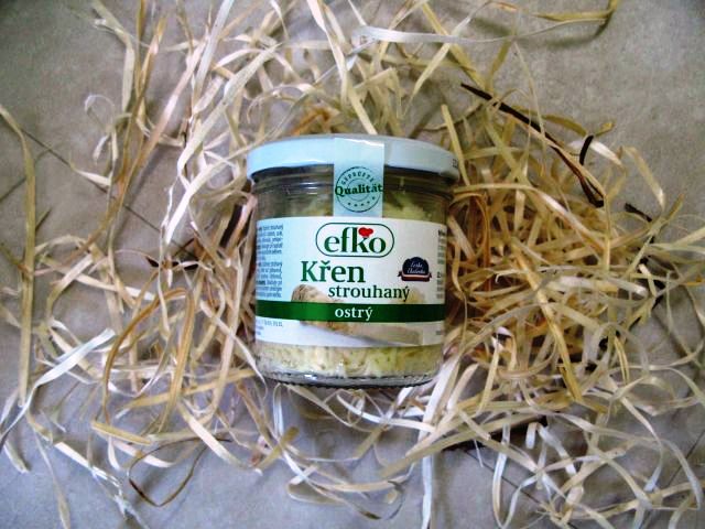 K předstrouhanému křenu byl přítel původně trochu skeptický, ale nakonec se ukázalo, že zbytečně. Stejně jako okurky a další výrobky, které od Efka kupujeme, je i křen kvalitní a chutí autentický. Dokonce i výrazně pálí. Přijde mi ale spíš jako výrobek pro mě, protože jeho hlavní výhodou oproti normálnímu křenu je, že se s tímhle nemusím strouhat.