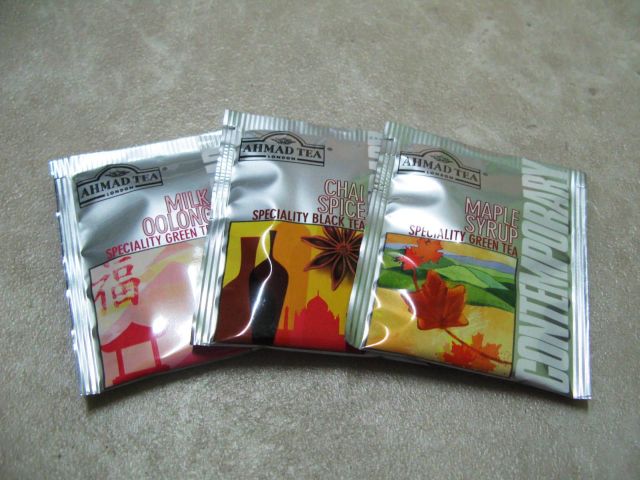 Tři pytlíčky čaje, tři různé nové příchutě. Značku Ahmad Tea pravidelně kupujeme a tahle novinka mě zaujala. Jde o tři kombinace: černý čaj se štiplavým hřebíčkem, zázvorem a skořicí, zelený čaj s javorovým sirupem a mléčný oolong.