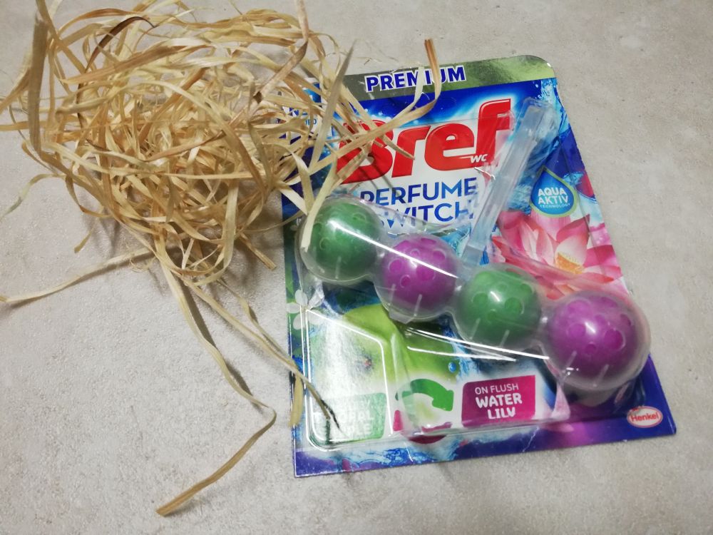 Tento nový WC blok slibuje dvojitou vůni. Při spláchnutí a pak po zaschnutí má být cítit rozdílně – jednou po leknínech, pak zase po jablkách. Já jsem spíš permanentně cítila jakousi směs. Ta ale pěkně provoněla toaletu, takže si nestěžuji.
