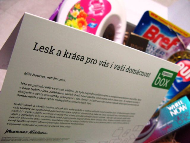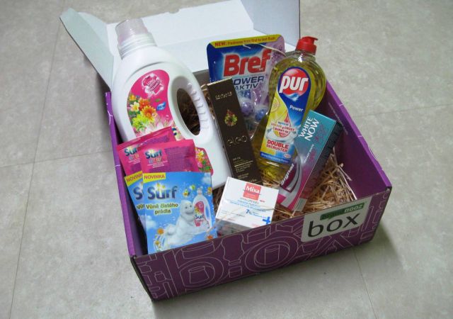 Tentokrát jsme vyzkoušeli třeba novou zubní pastu od Signalu, která zuby vybělí a vyleští, anebo účinný gel na praní s příjemnou tropickou vůní. Vše bylo zabaleno do výjimečně fialové krabice vystlané syntetickou slámou, aby se nic nerozbilo.