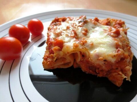 Sójové maso uvaříme podle návodu ve vodě s bujonem. Na rozpáleném oleji mezitím orestujeme nakrájenou cibulku, nastrouhanou mrkev a prolisovaný česnek. Přidáme sójový granulát, rajčatové pyré a okořeníme podle chuti. Pekáček vyložíme plátky lasagní, na něž rozprostřeme část omáčky a opakujeme do vyčerpání ingrediencí. Vše zasypeme eidamem a pečeme na 180 °C asi 30 minut.